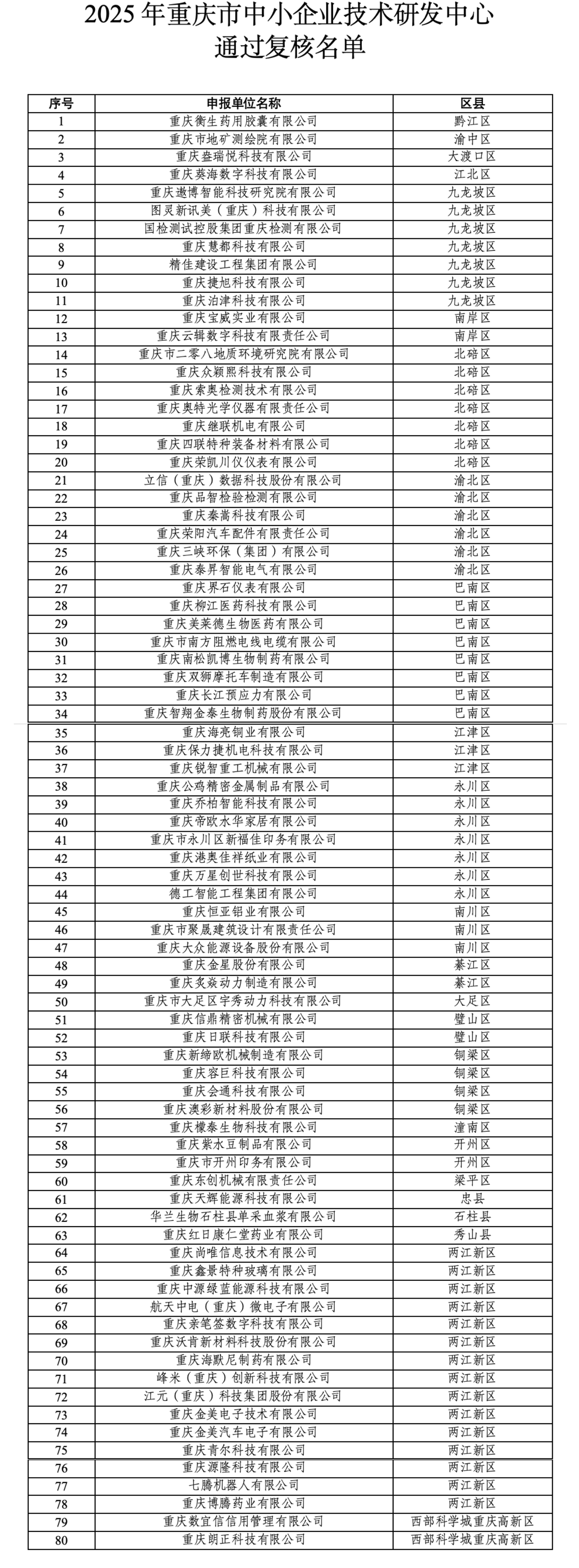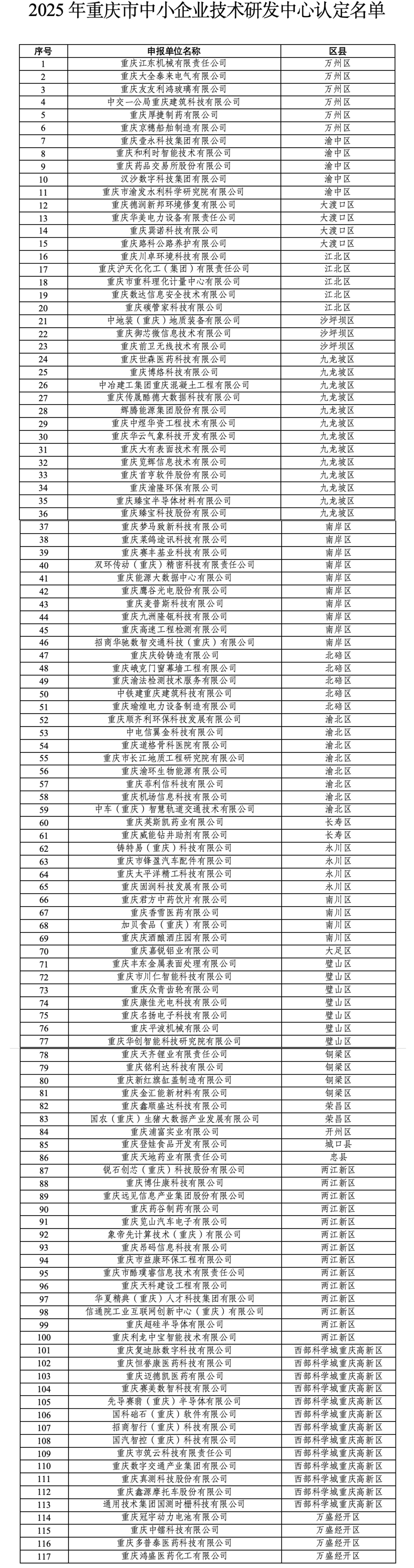 10月17日,重庆市经济信息委正式公布了2025年重庆市中小企业技术研发中心认定名单及复核结果,其中新认定117家,通过复核80家。