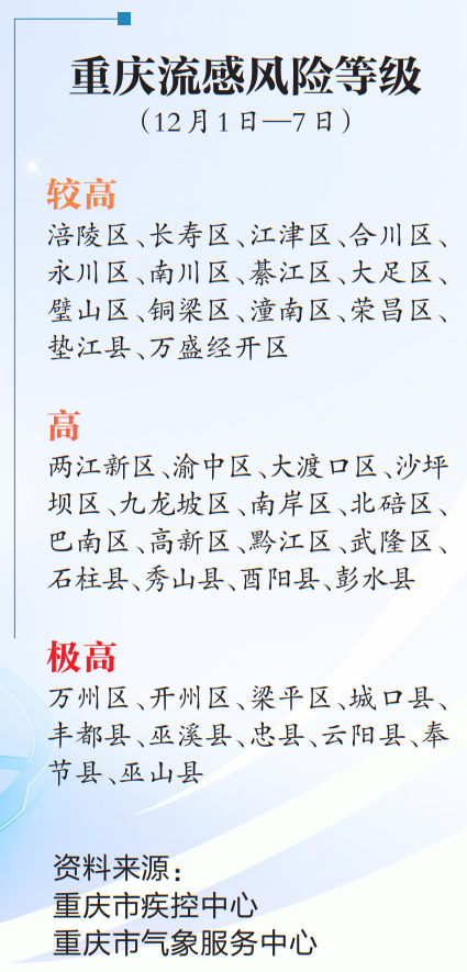 数据显示,12月1日—7日,两江新区、渝中区、大渡口区、沙坪坝区、九龙坡区、南岸区、北碚区、巴南区、高新区、黔江区、武隆区、石柱县、秀山县、酉阳县、彭水县流感风险等级高,涪陵区、长寿区、江津区、合川区、永川区、南川区、綦江区、大足区、璧山区、铜梁区、潼南区、荣昌区、垫江县、万盛经开区流感风险等级较高,万州区、开州区、梁平区、城口县、丰都县、巫溪县、忠县、云阳县、奉节县、巫山县流感风险等级极高。