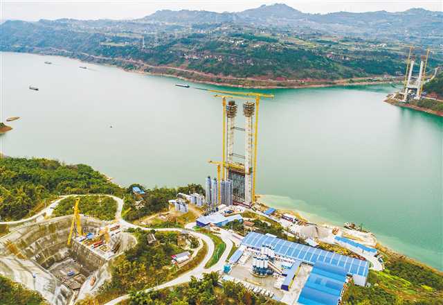 2月29日,万州环线高速新田至高峰段新田长江大桥正在加紧施工。