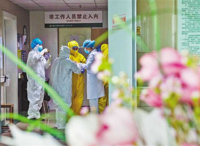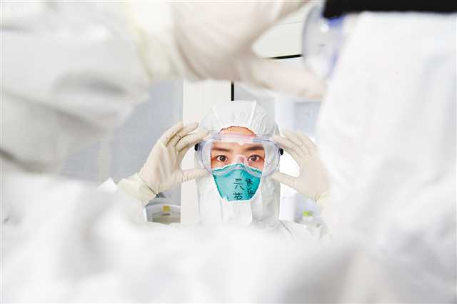 3月8日,重庆三峡中心医院百安分院,女性医护人员正在穿防护服。当日是“三八”国际劳动妇女节,在疫情防控一线有无数女性医务工作者默默地坚守着自己的岗位,以特殊的方式度过节日。记者 龙帆 摄