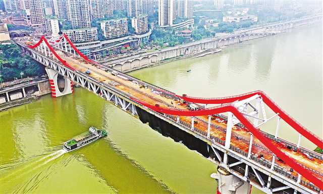 10月11日,曾家岩嘉陵江大桥刚性悬索已穿上“红装”,鲜艳的“中国红”引人注目。据介绍,建桥工人正加紧大桥涂装工程施工,力争11月左右完成涂装。