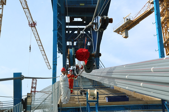 在过去近一个月内,面对索股架设任务重、超高空作业环节多、安全风险程度高等施工难点,项目施工人员科学优化施工组织,不断优化技术方案,严格执行质量标准,有效保证工序衔接。按照“白天牵引、夜间调索”的循环施工模式,采用“双线往复式”牵引法作业,每天能完成5根索股的牵引任务,比传统的“单线往复式”牵引法作业效率更高、安全性能更好,提高工效近2倍。