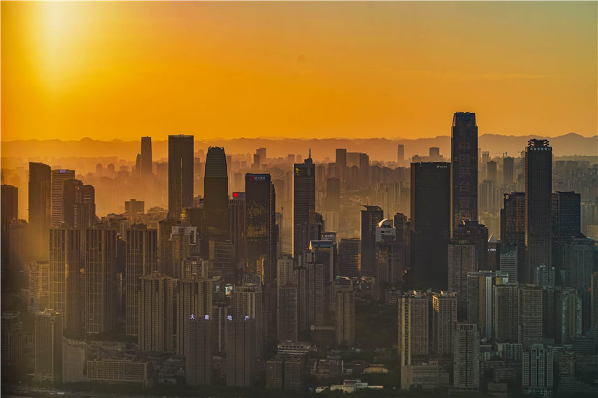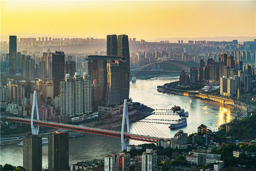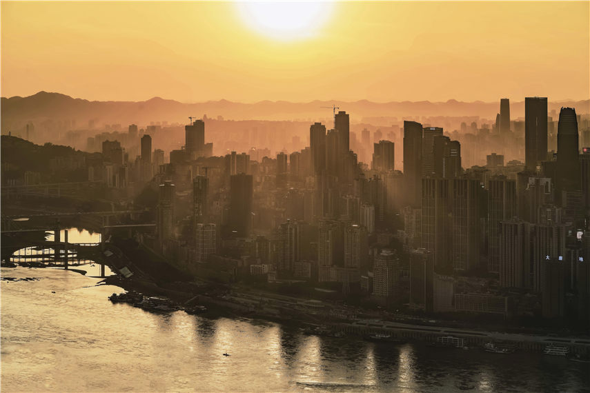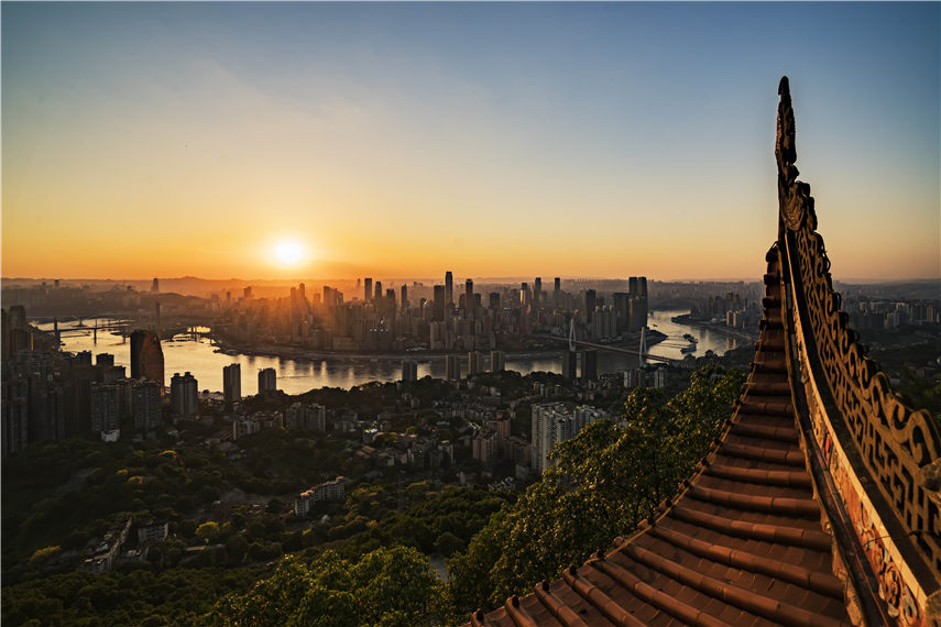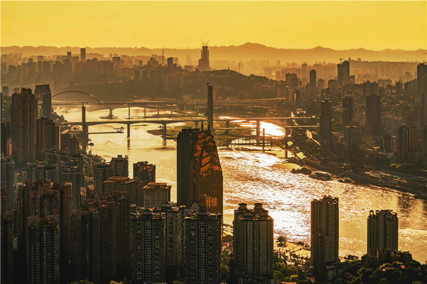 初夏时节,雨后的山城出现五彩缤纷的晚霞。在长江和嘉陵江交汇处,江面洒满落日余辉,泛起金光,将长江两岸装扮得美轮美奂。不少行人被眼前的美景所吸引,纷纷停下脚步,拿起手机拍摄。