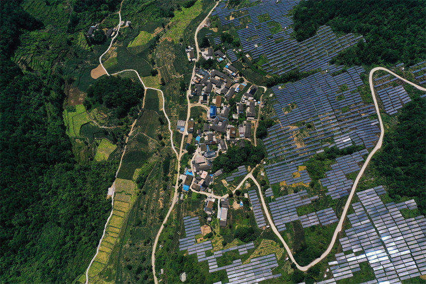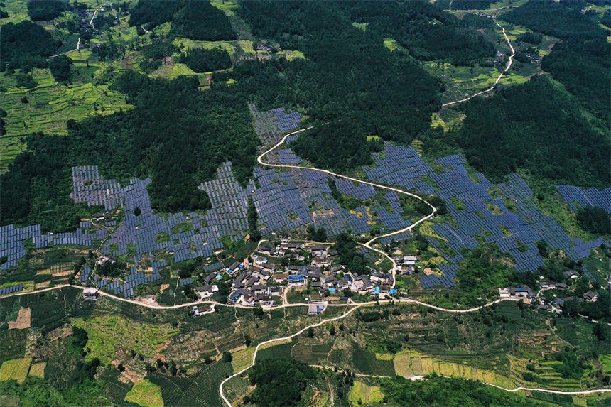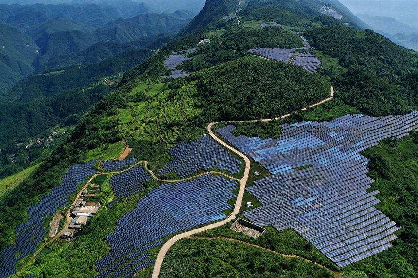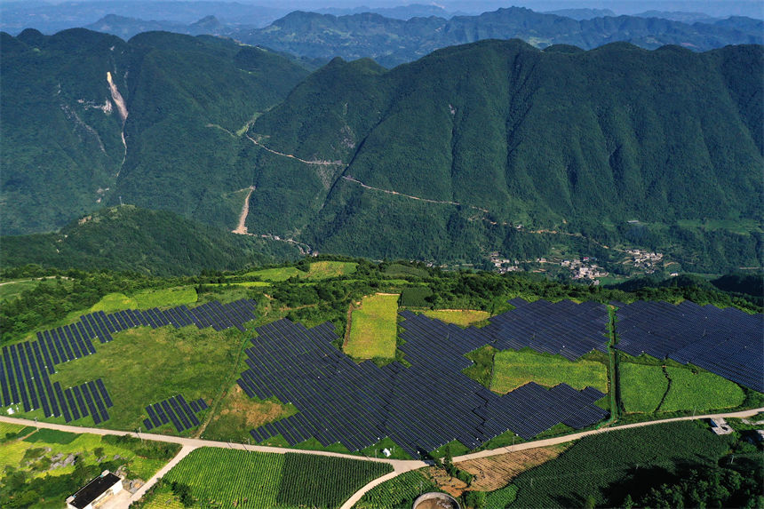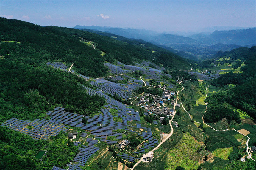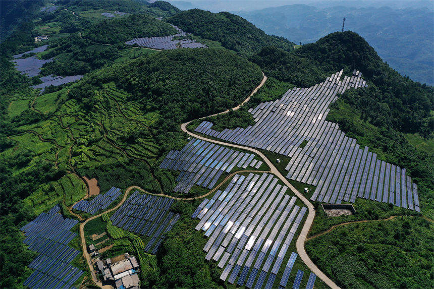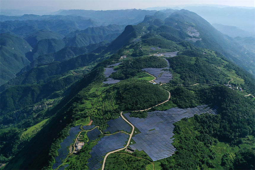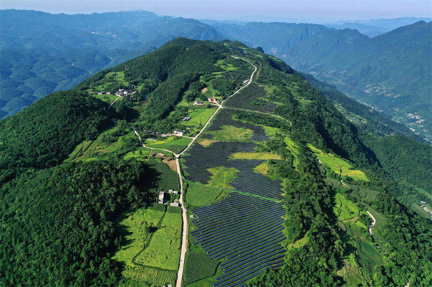 人民网-重庆频道消息,盛夏时节,在重庆市黔江区海拔1500多米的麒麟盖山上,安装在山间的30余万片光伏板,错落有致,形成蜿蜒的“光伏梯田”,与群山、农家、农田相互掩映,美如画卷,美不胜收。