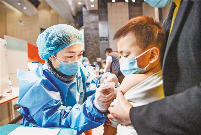 11月10日,九龙坡区谢家湾小学,一名护士正在为孩子接种新冠疫苗。九龙坡区从医疗机构调集300余名医疗技术骨干,组成6支接种队伍,连日来进入辖区内各小学、幼儿园,已为全区3-11岁人群中的三分之一完成了新冠疫苗接种。
