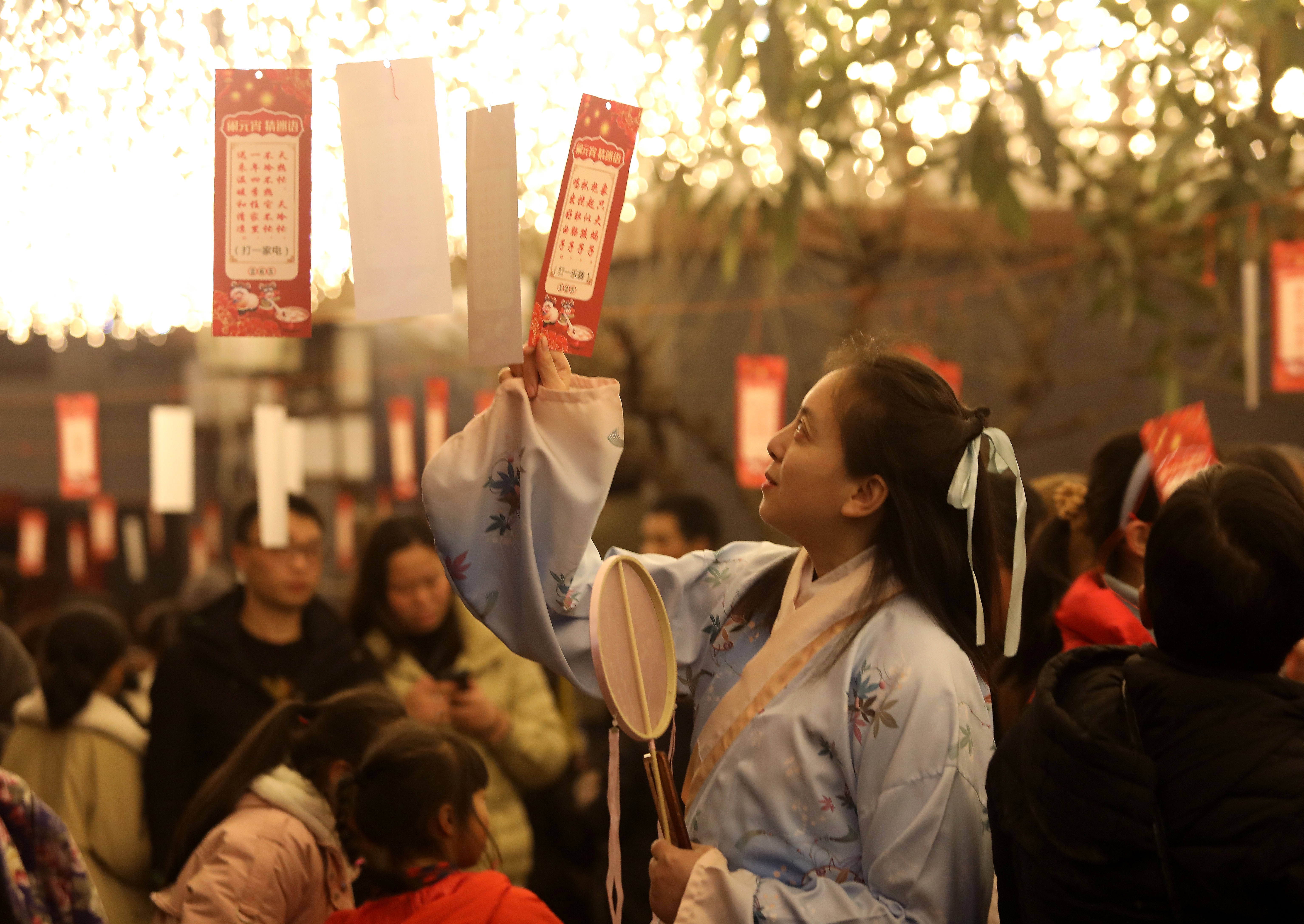 2022年2月14日,綦江区东溪古镇举行“我们的节日一一元宵节”特别活动,庆祝元宵佳节的到来。 赏花灯、猜灯谜、瞎子敲锣等活动,让人们感受到传统文化的气息,欢欢喜喜闹元宵。记者 罗斌 摄