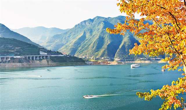 近日,航行在长江与大宁河交汇处江面上的游船,和青山、红枫一起,构成一幅秀美的山水画。