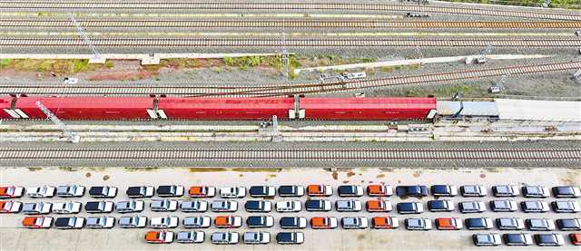 10月11日,重庆市永川国家高新区铁路专用线边,等待装运的长城炮皮卡、坦克300越野车,它们将搭乘专列出口至俄罗斯。