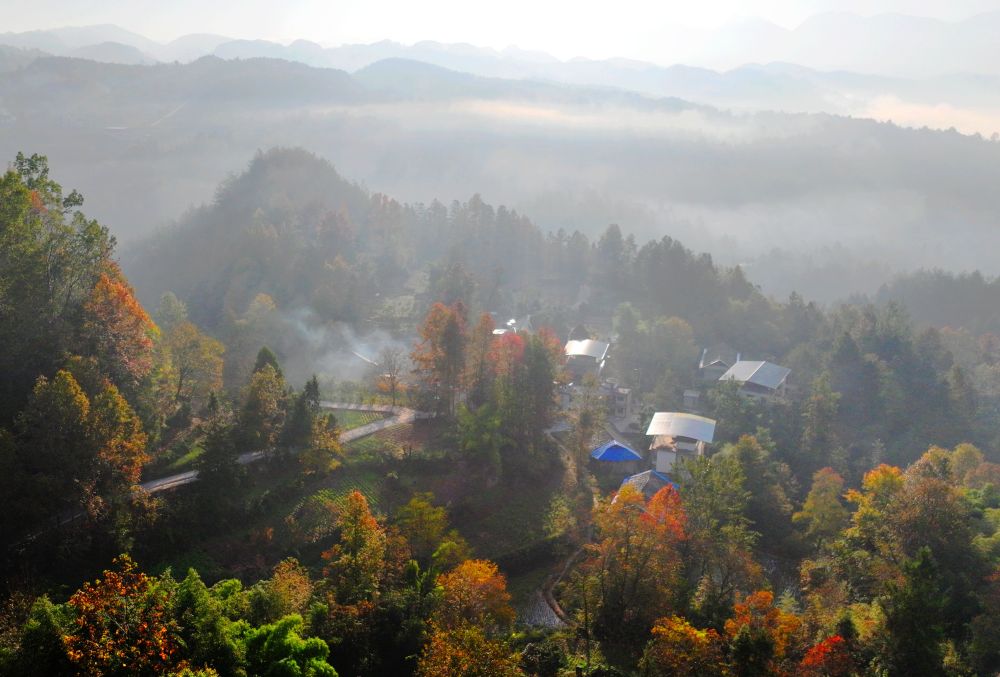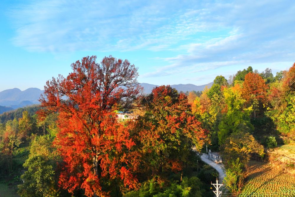 11月19日,酉阳县板桥乡境内,成片的枫叶彩林绚烂多彩,呈现一幅美丽的乡村画卷。特约摄影 陈碧生