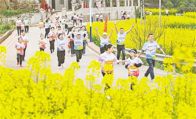 3月9日,大足区铁山镇西北村,参赛选手奔跑在花海之中。