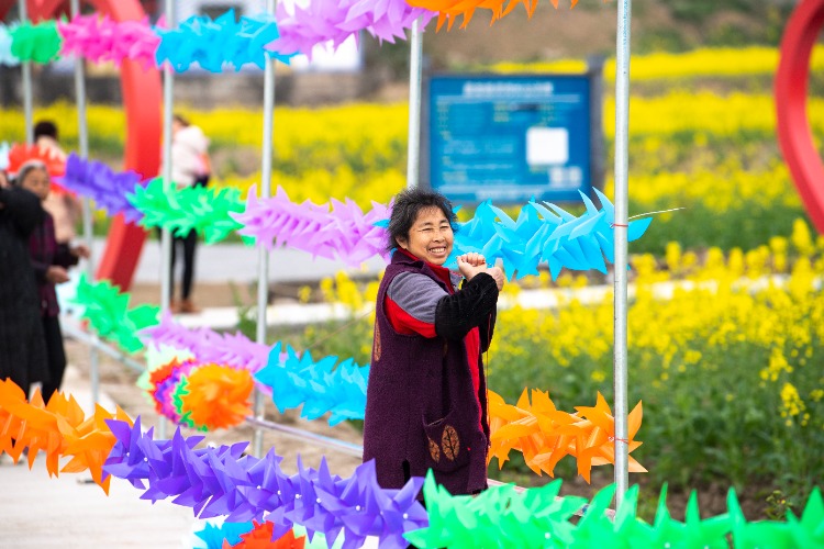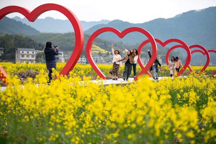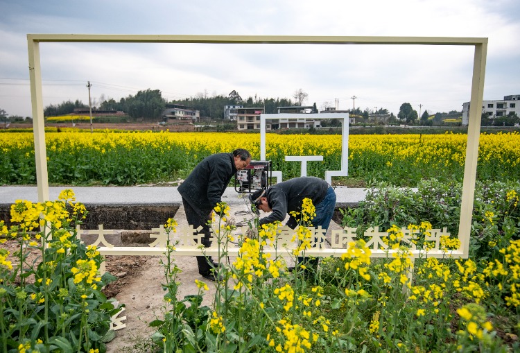 3月13日,梁平区回龙镇,数千亩油菜花竞相绽放,满目金黄,村民们正在花海边打造装饰,方便游客拍照。记者 郑宇 摄