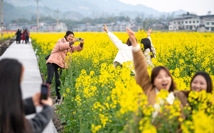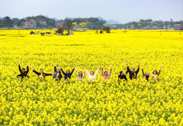 3月13日,梁平区回龙镇,数千亩油菜花竞相绽放,满目金黄,游客在这里拍照打卡。记者 郑宇 摄