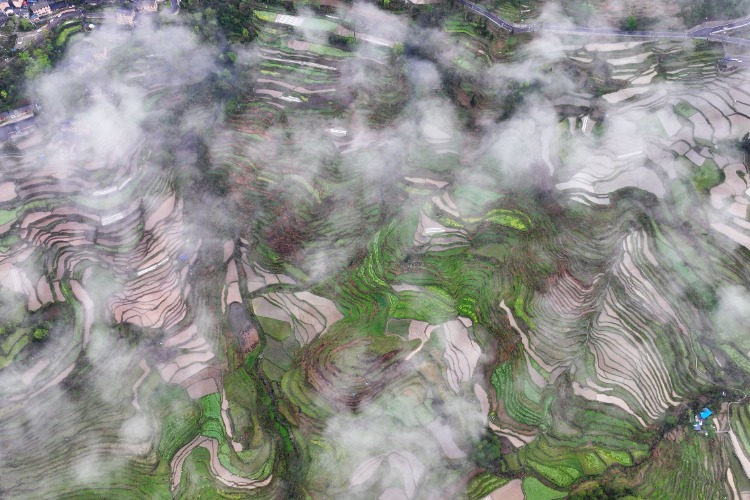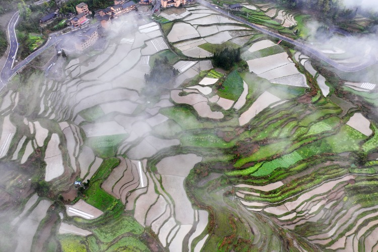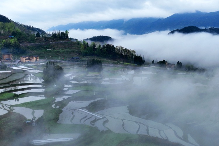 4月7日,酉阳县花田乡何家岩村,万亩蓄水的梯田如一面面明镜,波光粼粼、线条交错、层次分明,在薄雾映衬下美不胜收,宛如仙境。特约摄影 陈碧生