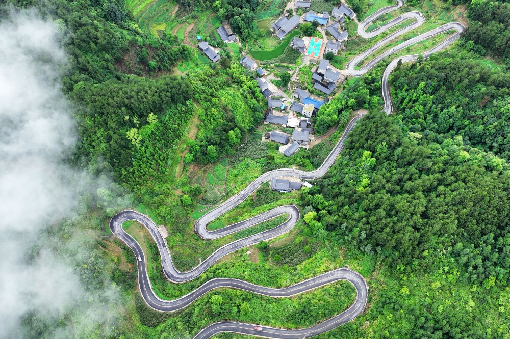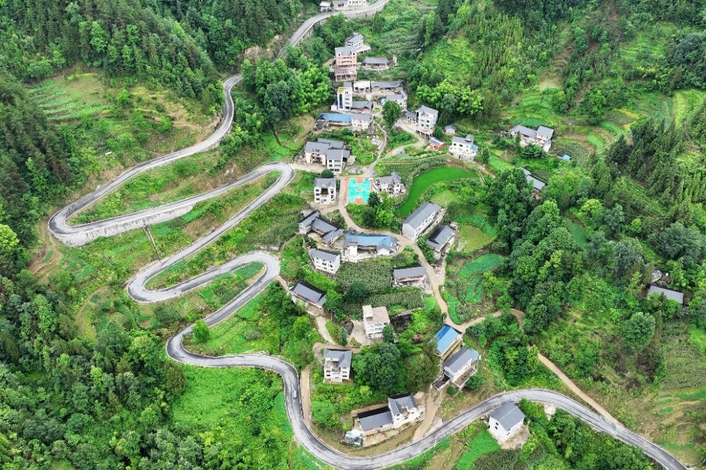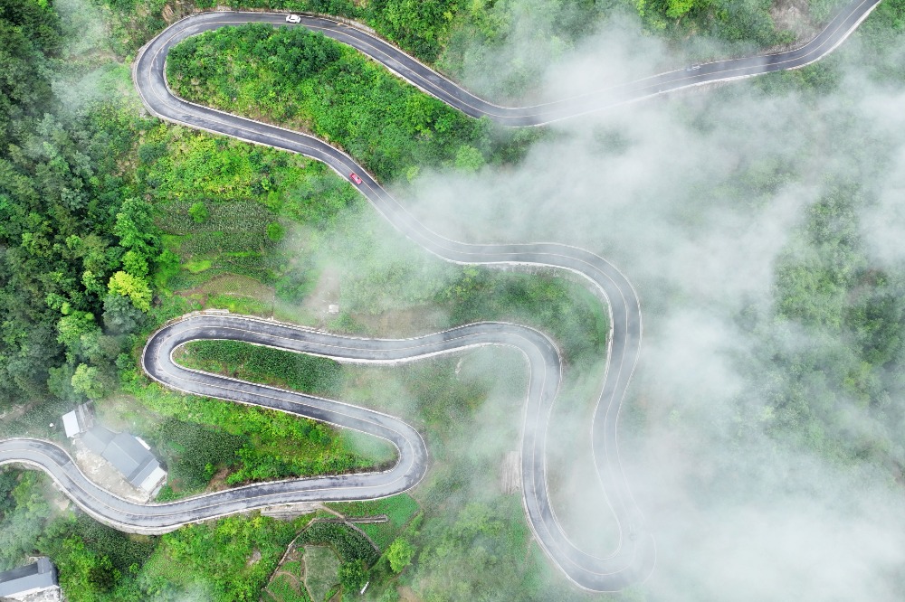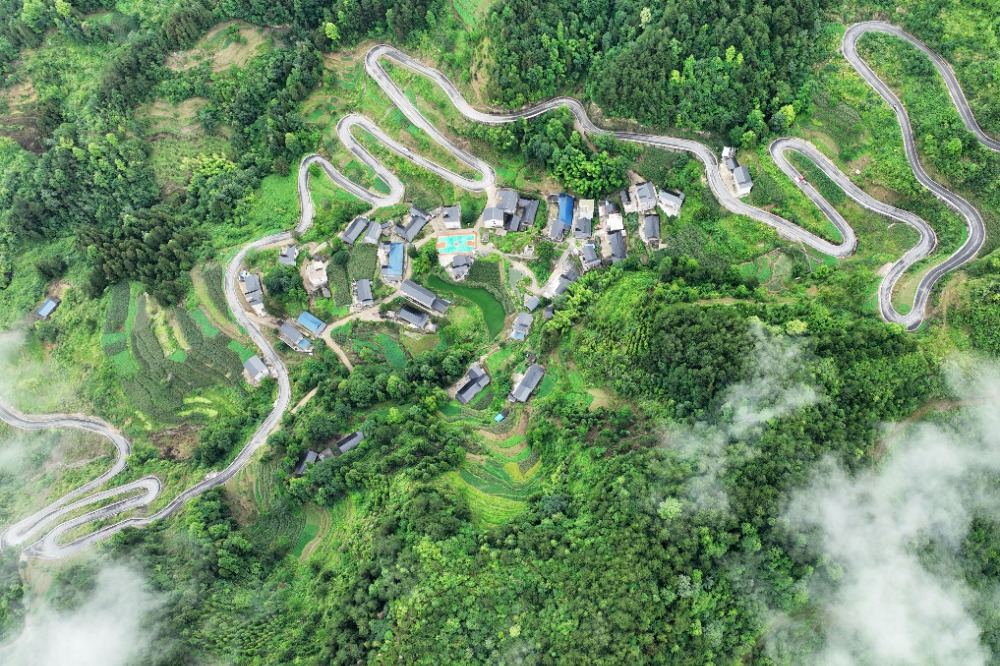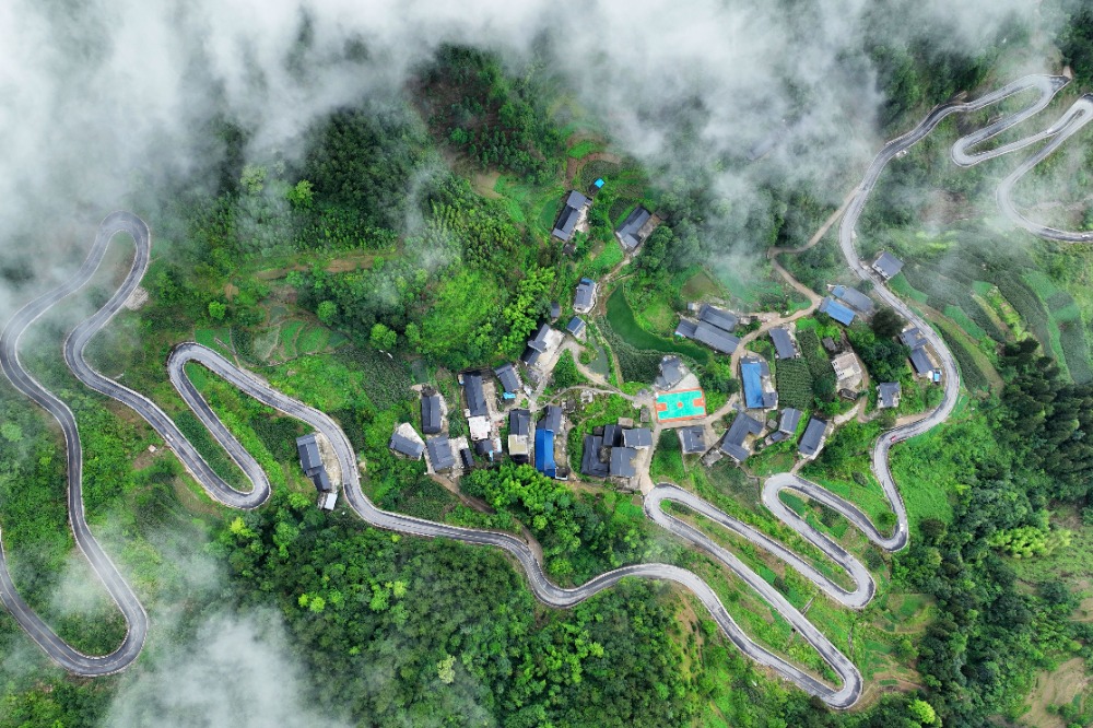 6月24日,酉阳县宜居乡董河村,农村四好公路蜿蜒盘旋在山间,和周边村舍、森林、云雾相互映衬,形成一幅美丽的乡村生态画卷。特约摄影 陈碧生
