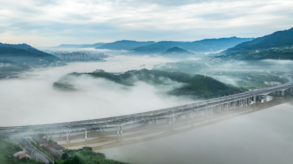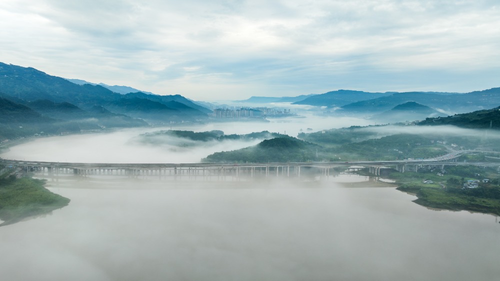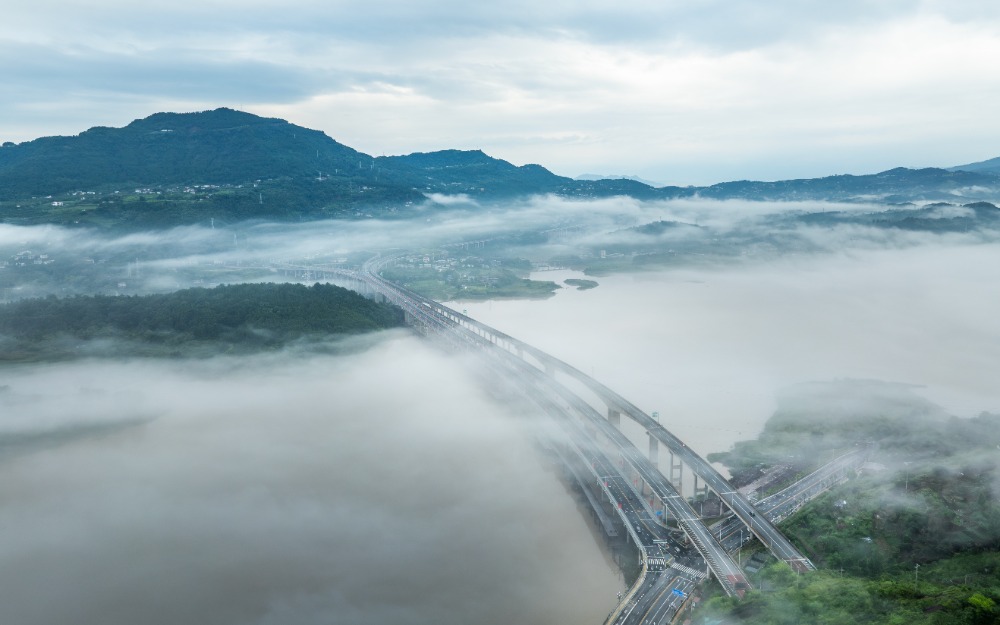 7月15日,开州区厚坝镇云雾缭绕,穿境而过的城开高速在青山、河流、城市的映衬下,宛如一幅水墨画,美不胜收。通讯员 王晓宇 摄