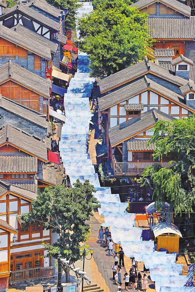 7月27日,渝中区十八梯传统风貌区,透着浓浓民族风韵的扎染天幕与传统巴渝风貌交相辉映,为市民和游客带来一丝丝清凉。
