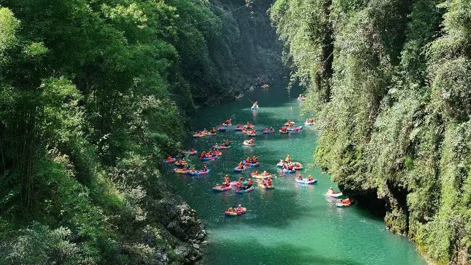暑期,阿依河迎来漂流高峰。近日,众多游客乘着橡皮艇,畅游在碧水青山之间,乐享夏日清凉和峡谷风光。
