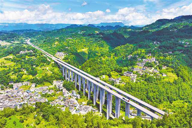 7月25日,黔江区石会镇老窖溪水库库区移民安置点,汽车行驶在石黔高速公路上。