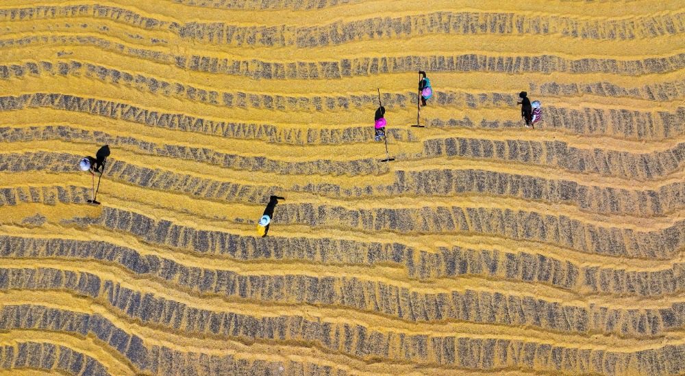 2025年9月15日,垫江县新民镇恬园山庄,工人在晾晒水稻(无人机照片)。特约摄影 龚长浩