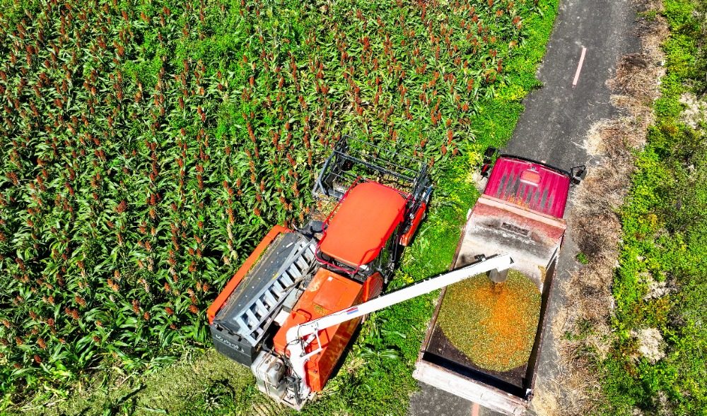 9月15日,垫江县新民镇恬园山庄,农机把收获的高粱装车(无人机照片)。