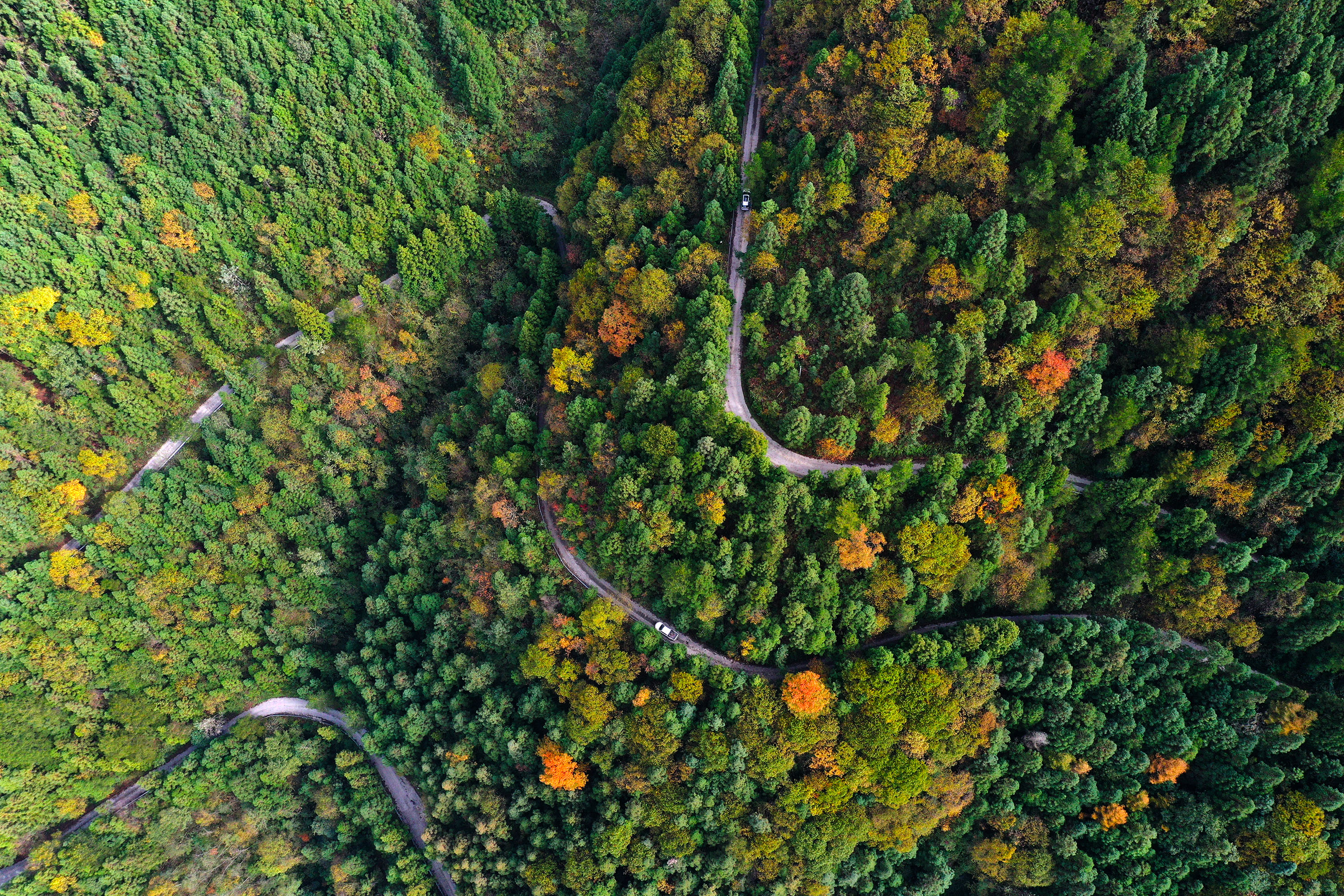 11月12日,黔江国家森林公园,车辆行驶在灰千梁子景区彩叶林间的公路上(无人机照片)。特约摄影 杨敏
