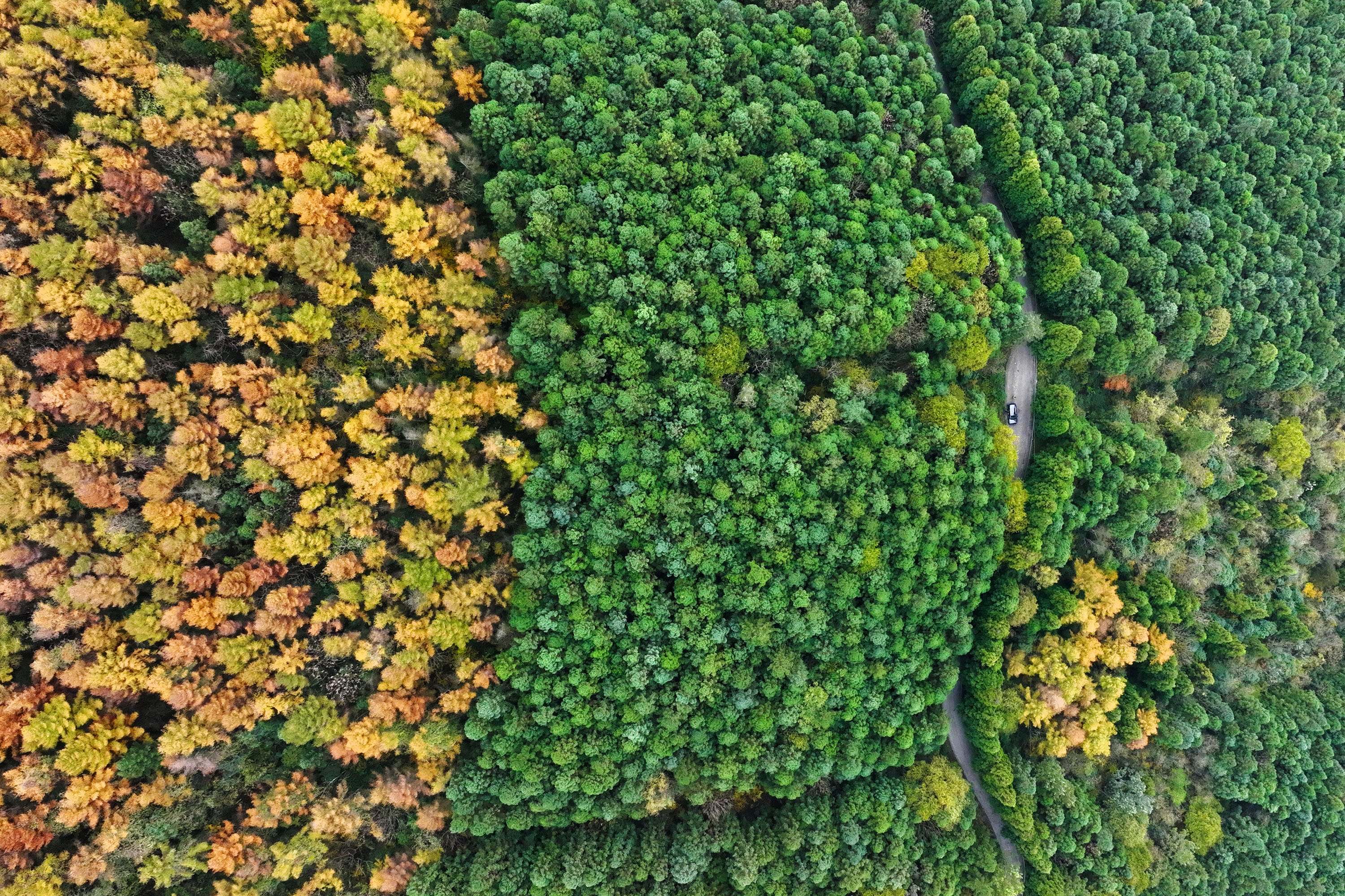 2025年11月12日,黔江国家森林公园,车辆行驶在灰千梁子景区彩叶林间的公路上(无人机照片)。特约摄影 杨敏