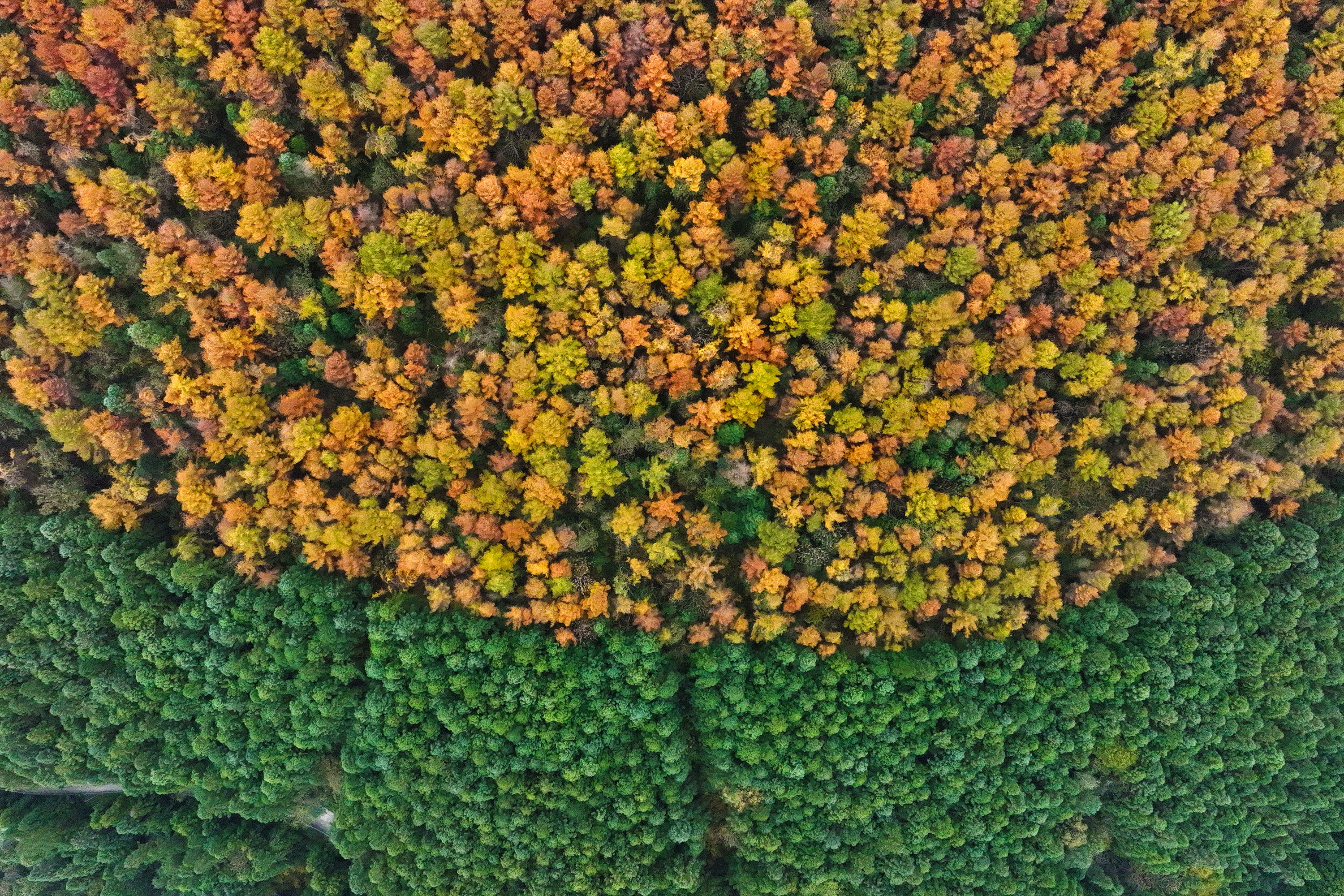 11月12日,黔江国家森林公园灰千梁子景区,落叶松与柳杉相间,呈现出“平分秋色”的景观(无人机照片)。特约摄影 杨敏
