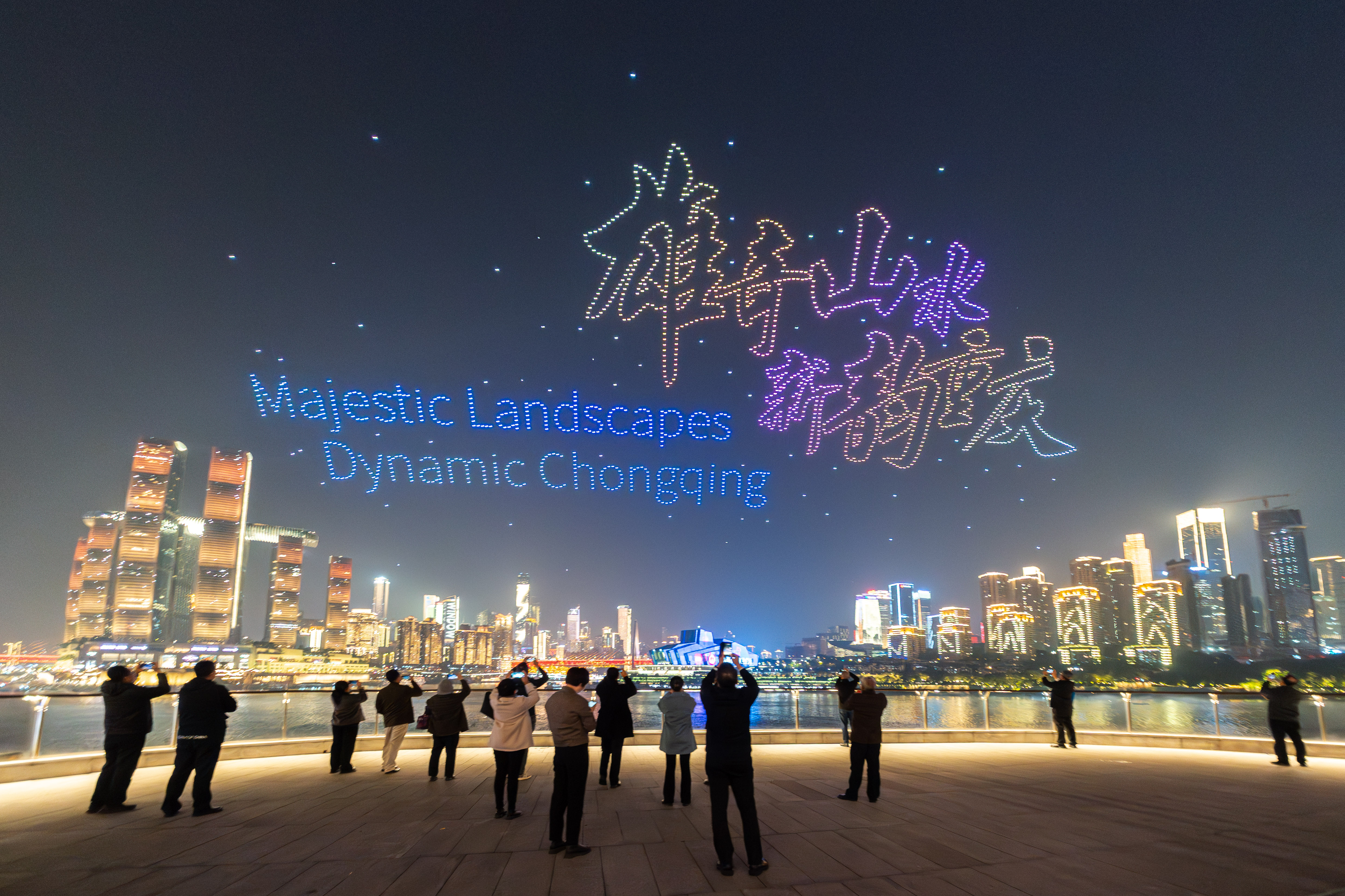 11月20日,重庆市规划展览馆,嘉宾以无人机灯光秀为背景合影留念。记者 李雨恒 摄