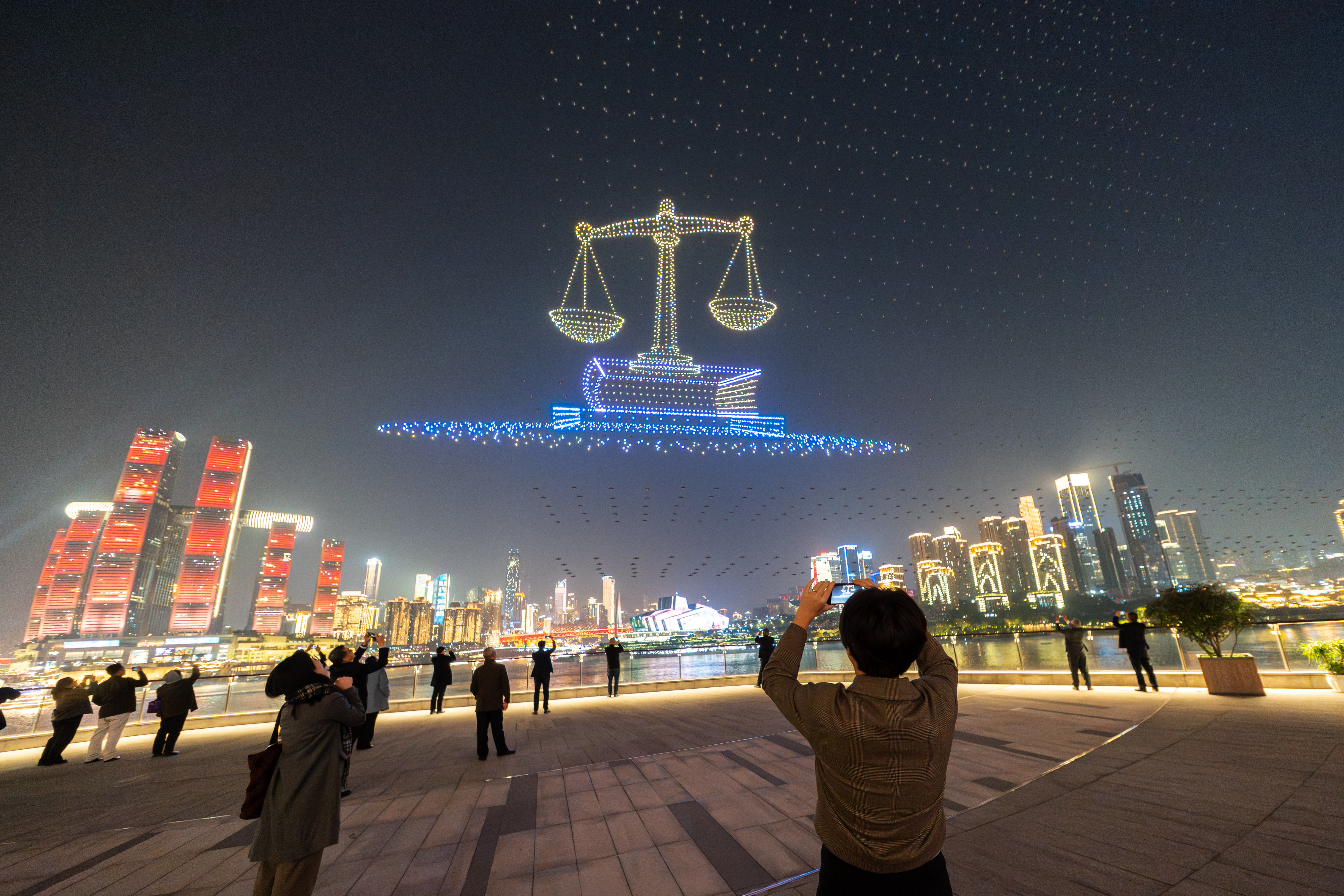 当日晚,“新韵重庆”无人机灯光秀在两江四岸核心区夜空上演,作为第七届中国—东盟法治论坛的主题展演,以璀璨光影将“法治之光”洒满山城。数百架无人机依次编队,呈现出论坛中英文字样、象征公平正义的金色天平、守护万家灯火的法槌等生动画面,生动诠释了“加强中国—东盟法治合作,共建周边命运共同体”的深刻主题,为观众带来一场科技与法治交融的视觉盛宴。