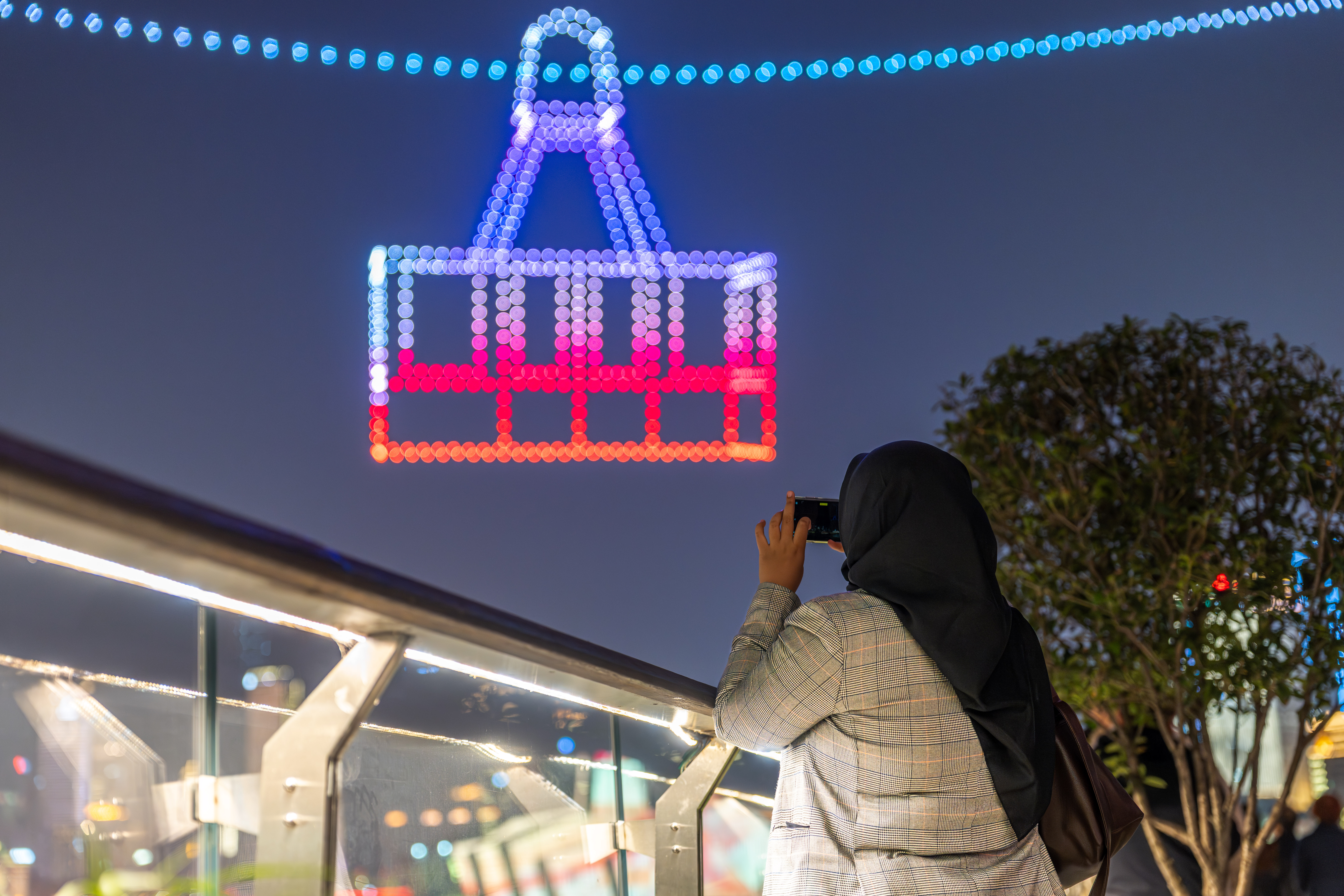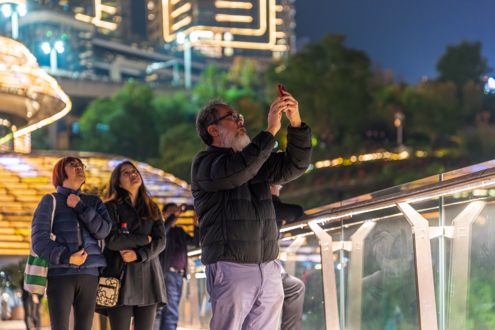 11月20日,重庆市规划展览馆,嘉宾们在欣赏精彩的无人机灯光秀。记者 李雨恒 摄