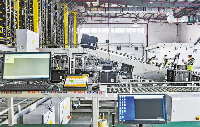3月20日,在位于两路寸滩保税港空港工业园的智慧共享物流中心,工作人员正在自动化立体仓库忙碌。