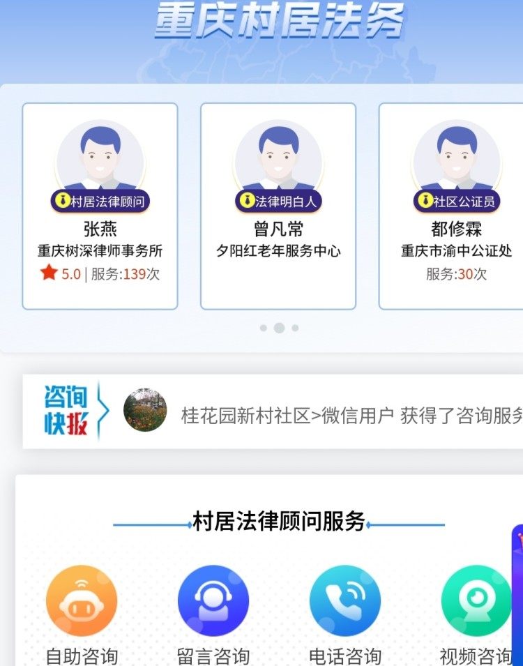 “重庆村居法务”小程序由重庆市司法局、重庆市大数据发展局联合推出,24小时为社区居民提供便民法律服务,节假日“不打烊”。