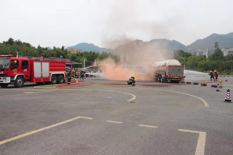 演练预设情景是,一辆旅游客车载客与一辆危化罐车相撞,旅游客车起火燃烧。事故发生后,参与求援的部门立即起动应急预案,对事故路段两侧实行临时交通管制,对受伤人员进行临时性现场救治,并对事故现场物证痕迹进行及时勘察、记录,绘制现场图,进行现场录像。交巡警在对现场勘查完毕后,施救车辆对现场车辆进行了拖离,现场交通得到了及时疏导、恢复。