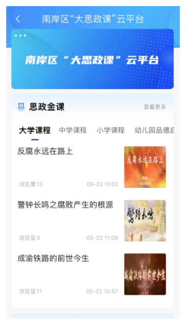 据介绍,南岸“大思政课”云平台依托“掌新南岸App”建立,是南岸区整合思政领域资源,集纳优质思政教育内容,面向全国思政教师、青少年群体打造的思政平台,也是该区坚持实践育人、共建共享,研究制定的“六个一百”育人新载体。