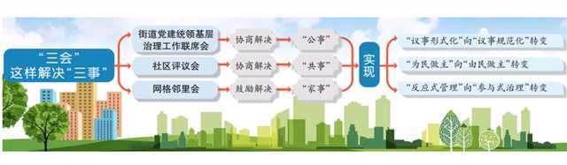 “公事共办、共事快办、家事自办。”鼎山街道党工委书记唐晓敏介绍,在“三事”分流基础上,由街道党工委牵头,共建单位、社区党组织等组成,成立街道党建统领基层治理工作联席会,协商解决政府管理事项和基本公共服务等“公事”;由社区党组织牵头,“两代表一委员”、网格长、金牌调解员、物业企业、民情信息员、民主监督员、群众代表等组成社区评议会,协商解决本社区居民之间的共同事务等“共事”;由网格党组织牵头,成立由网格长、网格指导员、专(兼)职网格员、民情信息员、调解员,以及网格党员、热心居民、志愿者等组成网格邻里会,对经议定属于“家事”的群众诉求,鼓励群众自力更生或通过市场途径解决,并尽力帮扶困难家庭和个人,逐渐摸索出一条引导民众理性合法表达利益诉求的通道,使群众参与基层治理的积极性明显提高。