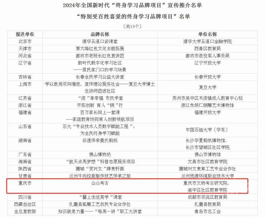 4月23日,记者从渝中区教委获悉,教育部日前公布了2024年全国新时代“终身学习品牌项目”宣传推介名单,渝中区培育打造的《公众考古》获评全国终身学习品牌项目,并首次入选“特别受百姓喜爱的终身学习品牌项目”名单(全国仅19个)。
