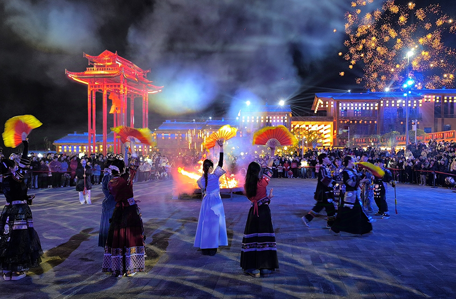 2月12日晚,“不夜边城·秀山有戏”街区内灯火通明,80余栋古风建筑在璀璨的光影交织中,显得更加细腻生动。渝的麻辣、湘的酸辣、黔的醇香,在同一盏灯笼下交融,洋溢着喜庆的节日氛围。广场上人头攒动,篝火晚会气氛热烈,火光照着人脸,烟花在头顶绽放,歌声与笑声交织回荡。