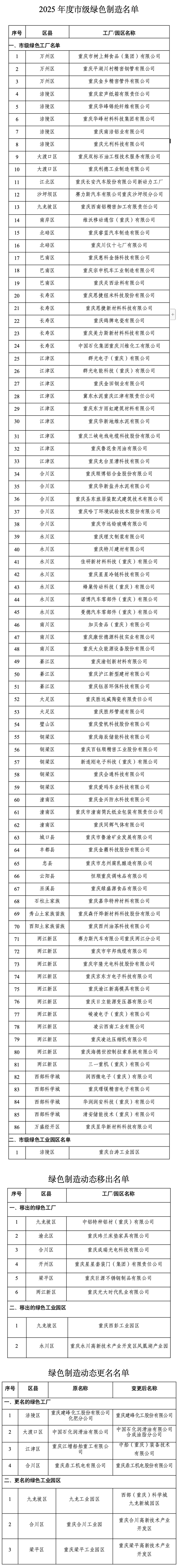 另外,按照动态管理相关要求,经各区县经信部门核实,将6家绿色工厂、2家绿色工业园区移出市级绿色制造名单,7家单位变更名称。