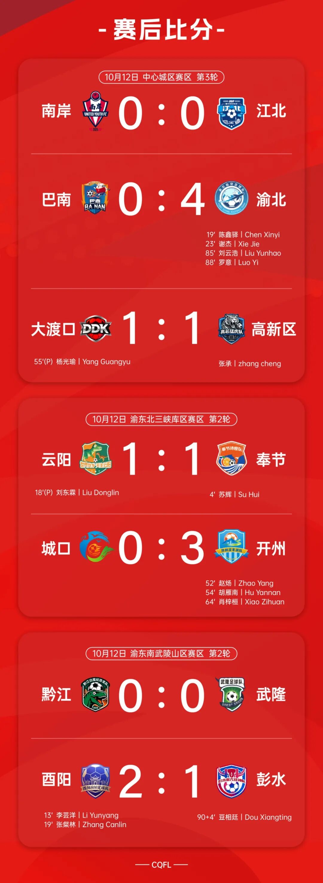 第19分钟,渝北在巴南禁区打出精妙配合,陈鑫驿率先破门得分。第23分钟,渝北再度打出反击,将比分扩大为0:2。比赛最后10分钟,渝北突然加快比赛节奏,在第85分钟和第88分钟由刘云浩和罗意连进两球,将比分锁定为4:0。
