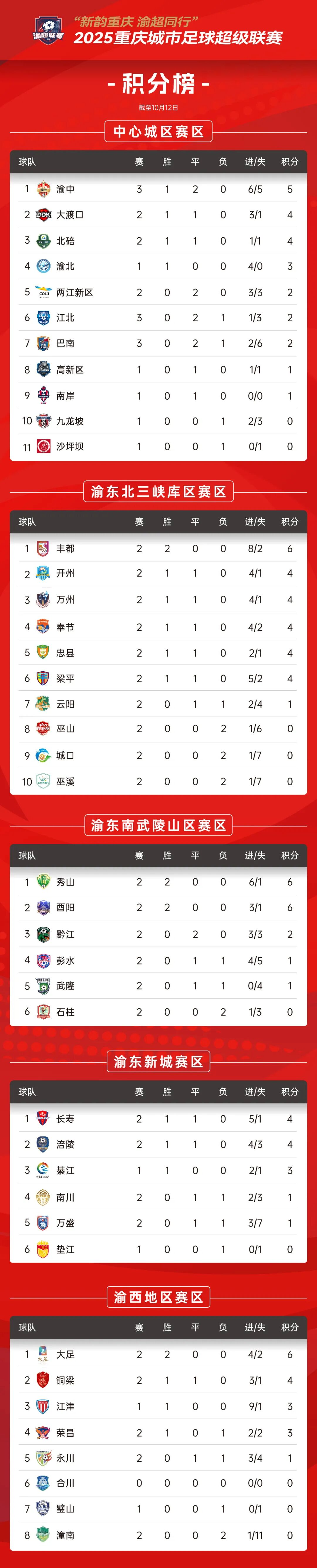渝超联赛积分榜