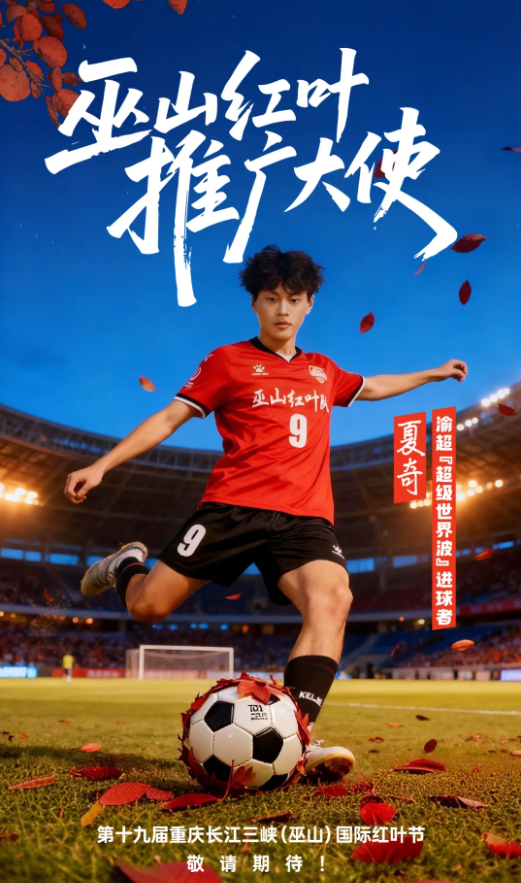 这个精彩进球让夏奇、巫山红叶队和“渝超”成功出圈。10月14日,巫山县方面宣布,聘任19岁小将夏奇为第十九届重庆长江三峡(巫山)国际红叶节“巫山红叶推广大使”。巫山方面表示,此次聘任不仅是对夏奇竞技实力的肯定,更源于他在赛场上展现出的越挫越勇、逆境绽放的拼搏精神,与巫山红叶历经寒霜却愈发炽烈的精神内核高度契合。