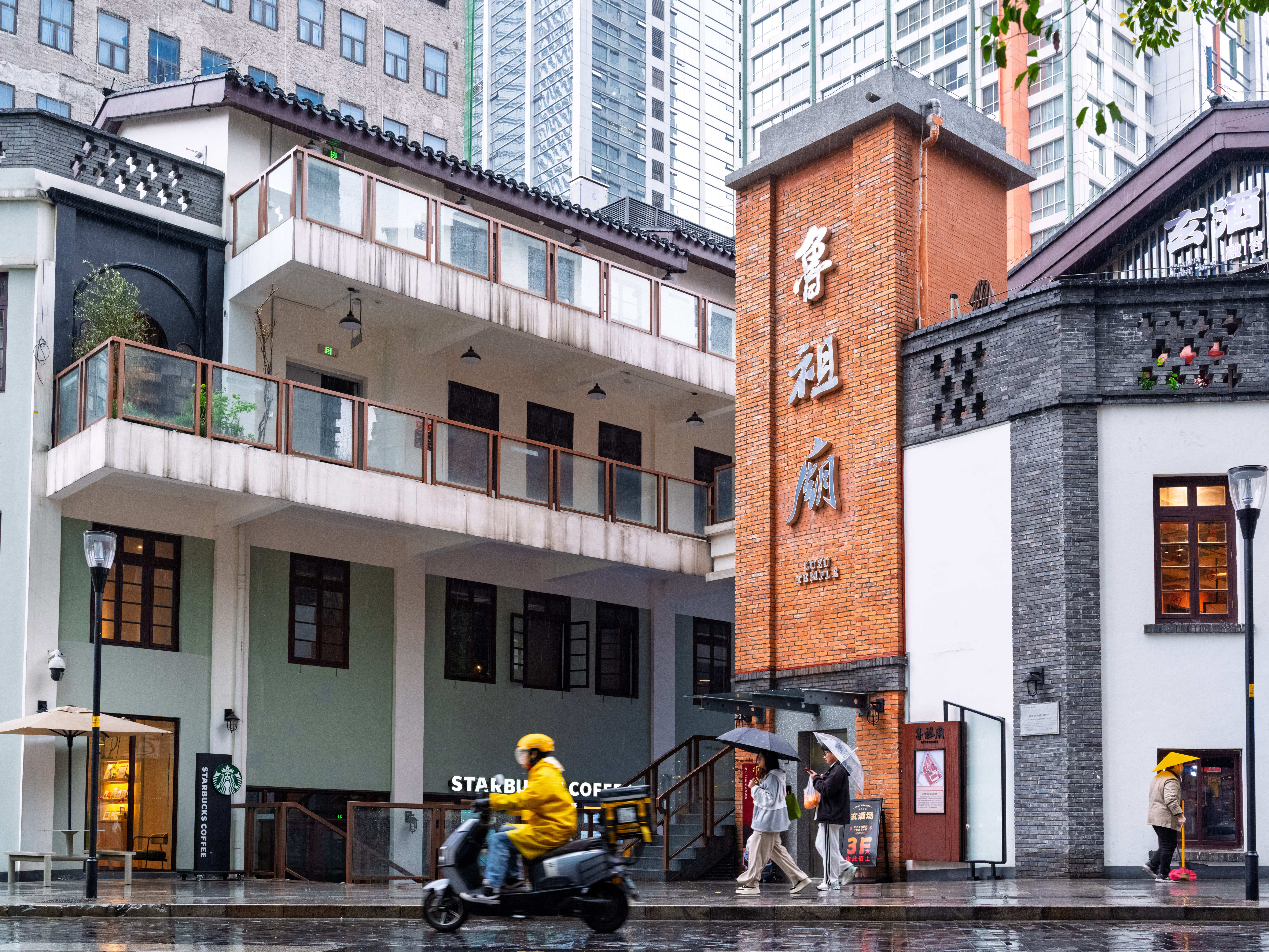 初冬的渝中区鲁祖庙传统风貌区,在绵绵细雨中更显韵味。雨水浸润着古建筑的青瓦白墙、飞檐翘角,为这条跨越百年的老街平添几分历史的厚重与静谧。