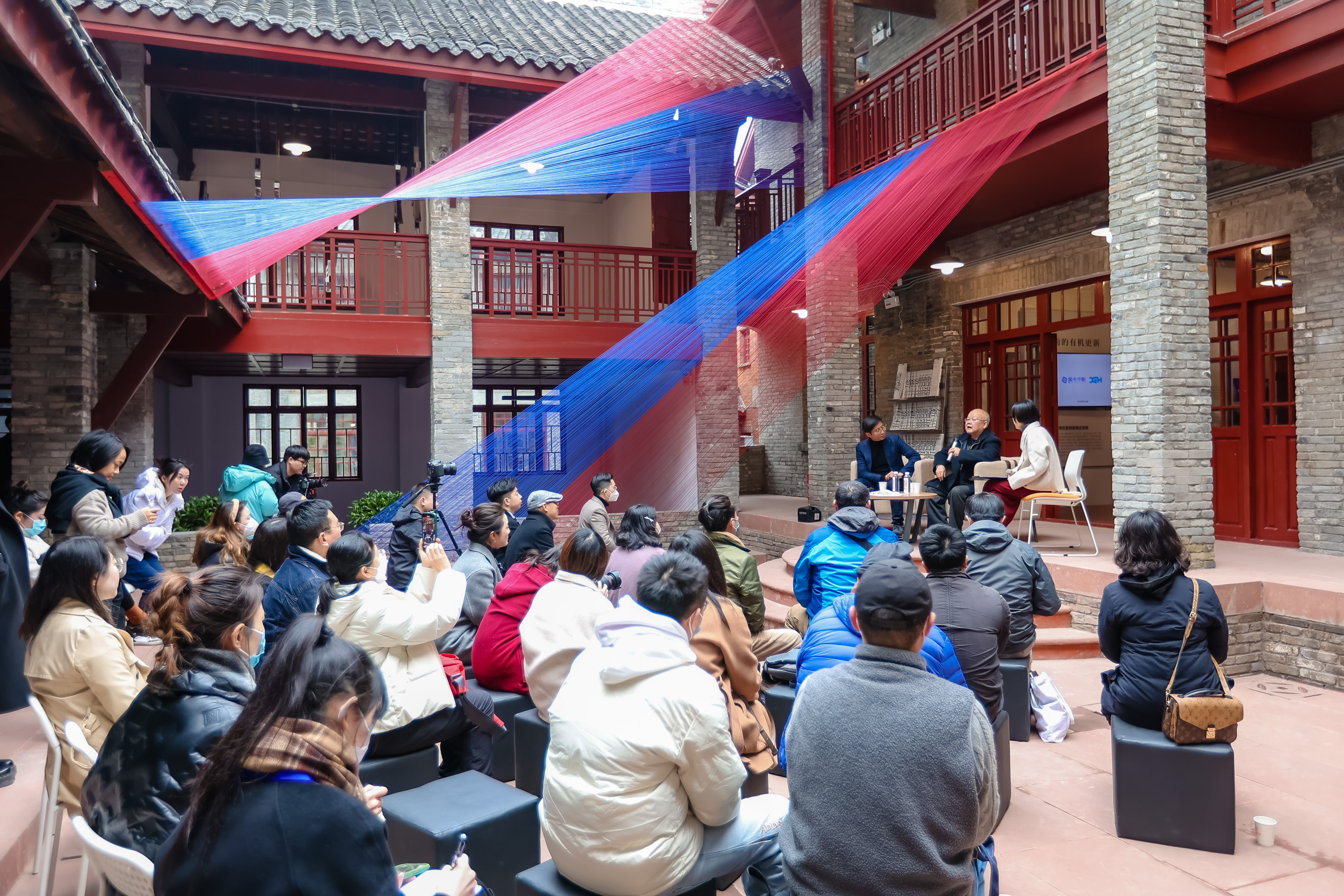 而整个祠堂街项目的色彩系统,则源于这条百年街巷的在地文化“基因”。抗战时期,这里坐拥成都70%的书店,各大报刊、文艺社团云集于此,是当时成都最活跃的文化艺术中心。设计团队从中提炼出三种专属色:“蜀韵蓝”,源自成都非遗蜀锦蜀绣的传统蓝色;“银杏黄”,来自成都市树银杏的灿烂;“先锋红”,则烙印着街上《新华日报》旧址的红色记忆。