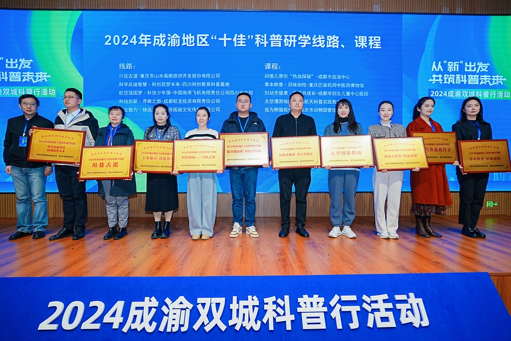 近年来,成渝两地的科普基地在科普能力提升、科普活动策划开展等方面深耕细作,创新性地开展了一系列科普工作,各具特色,并取得了较好的成效。活动现场对2024年成渝地区“十佳”科普研学线路、课程、基(营)地和导师进行了授牌。其中,“十佳”科普研学线路和课程包括川盐古道、科学启迪智慧·科创筑梦未来,我为熊猫摘竹子等;“十佳”科普研学基(营)地和导师包括成都博物馆、成都川菜博物馆,重庆师范大学的付文博等。