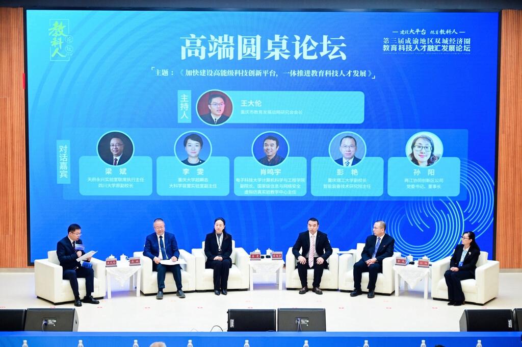 天府永兴实验室联席执行主任、四川大学原副校长梁斌;重庆大学超瞬态大科学装置实验室副主任李雯;电子科技大学计算机科学与工程学院副院长、国家级信息与网络安全虚拟仿真实验教学中心主任肖鸣宇;重庆理工大学副校长、智能装备技术研究院主任彭艳;重庆两江协同创新区公司党委书记、董事长孙阳聚焦“建设高能级科技创新平台,一体推进教育科技人才发展”主题,从平台定义、成果转化、人才培养、产业布局、产学研用协同五个维度开展了精彩纷呈的观点碰撞。