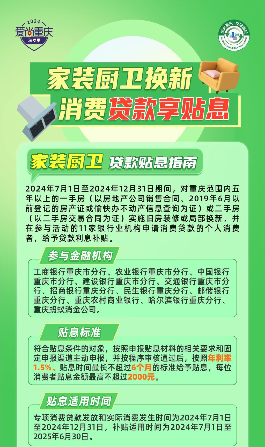 贴息适用哪些对象?需同时满足以下四个方面条件:一是年满18周岁的个人消费者;二是消费者旧房装修、局部换新的房屋所在地应在重庆市内,须为五年以上的一手房(以房地产公司销售合同、2019年6月以前登记的房产证或渝快办不动产信息查询为证)或二手房(以二手房交易合同为证);三是消费者在2024年7月1日至2024年12月31日期间向重庆市内参与本次活动的银行业金融机构(含消费金融公司)申请了专项消费贷款,其单笔申请金额不少于5万元,实际使用金额不少于3万元,贷款期限不少于6个月;四是向银行业金融机构申请贷款的消费者与拟装修房屋产权人(含部分产权)需为同一人。