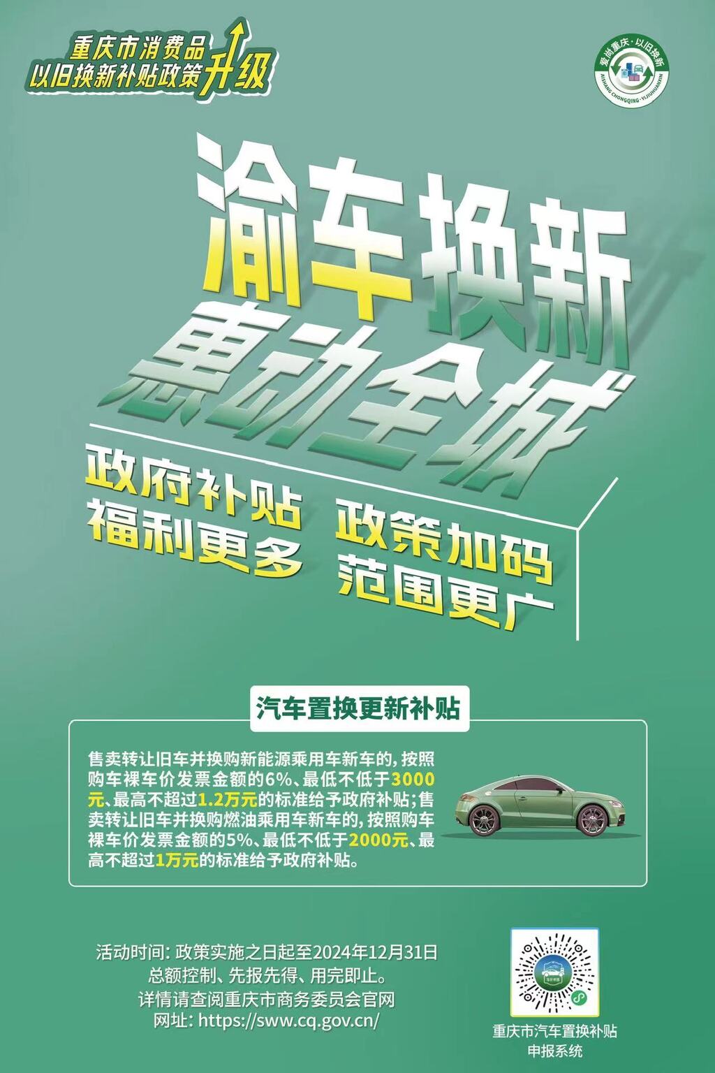 个人消费者在全国范围内售卖转让了2024年5月20日及以前已登记在本人名下的旧乘用车(含新能源车和燃油车),并于2024年5月21日至2024年12月31日期间在重庆市辖区内汽车销售企业购买新能源乘用车新车的,由原实施的分档补贴政策(20万以上补3000元,20万元以下补2000元),调整为按照购车裸车价发票金额的6%、最低不低于3000元、最高不超过1.2万元的标准给予补贴;并将卖旧车后购置燃油车新增纳入补贴范围,于2024年8月20日至2024年12月31日期间购买燃油乘用车新车的,按照购车裸车价发票金额的5%、最低不低于2000元、最高不超过1万元的标准给予补贴。