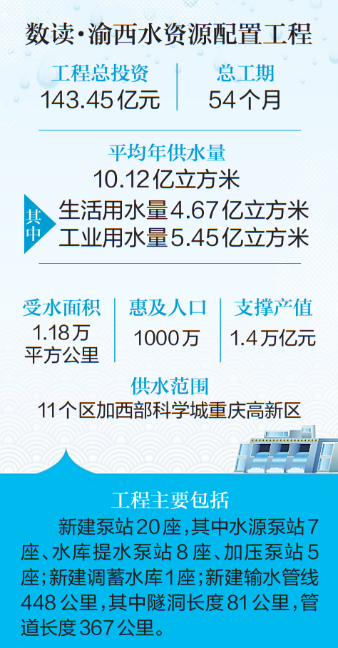 工程投运后,每年将从长江、嘉陵江新增供水量10.12亿立方米,占供水区域城镇总供水量的52%。其中生活用水4.67亿立方米,惠及近1000万居民,城乡生活供水保证率由92%提升至95%;工业用水5.45亿立方米,支撑渝西地区1.4万亿元生产总值,工业用水保证率达95%以上。