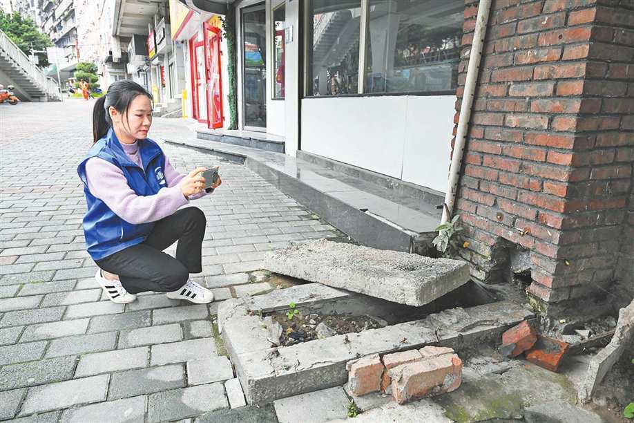 上午8点,冬日的晨雾尚未完全散去,刘英开始了一天的例行巡查。沙坪坝正街,她在这条路上不知走过多少遍,对这条街上的每一个井盖位置和样式都非常熟悉。此时,她目光敏锐地扫视着沿途的市政设施。当她行至一家酒吧门前时,脚步停了下来——人行道上一块用于覆盖地下沟渠的盖板有明显移位,露出了宽10多厘米的槽口。