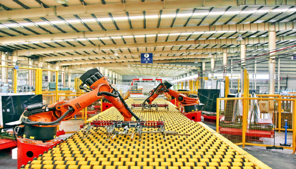 万盛福耀玻璃车间,机械手将玻璃下线装箱